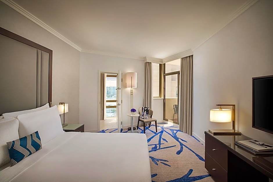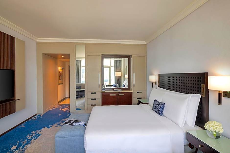 This Sea View Suite with Balcony and Lounge Access is 145sqm, this club suite features one bedroom with separate living room including a dining table for four people, two private balconies with sea views, a (™) jacuzzi bath and a walk-in rain shower.